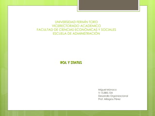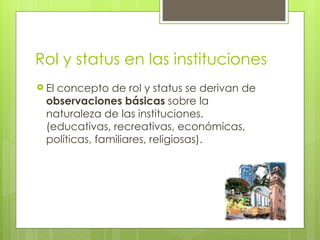 El documento describe los conceptos de rol y status. El status es la posición o nivel de una persona en un grupo, mientras que el rol es el comportamiento esperado de alguien que tiene un determinado status. Cada status conlleva un conjunto de roles y expectativas de comportamiento. Rol y status están relacionados y forman parte integral del análisis del comportamiento social.