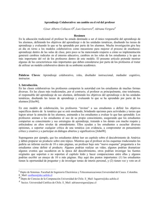 Este documento describe el cambio en el rol del profesor de uno tradicional a uno colaborativo. En un modelo colaborativo, los profesores comparten la autoridad con los estudiantes, invitándolos a definir objetivos y actividades de aprendizaje y animándolos a evaluarse unos a otros. El documento propone tres nuevos roles para los profesores: diseñador instruccional, que define objetivos y tareas; instructor, que guía a los estudiantes; y mediador cognitivo, que facilita el diálogo y la resolución de problemas entre
