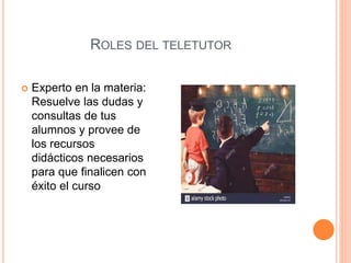 El documento describe los cinco principales roles de un teletutor: orientador, experto en la materia, integrador, dinamizador y coordinador. El teletutor guía a los estudiantes, resuelve dudas sobre la materia, promueve la interacción entre compañeros, estimula la participación activa en proyectos colaborativos, y asiste con cuestiones técnicas y organizativas.