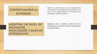 Este documento describe los roles del teletutor en trabajos colaborativos. El teletutor debe contextualizar la actividad para que esté relacionada con los objetivos de aprendizaje y situaciones reales. Adopta un papel de mediador, facilitador y guía para responder a las incidencias de los participantes. Define objetivos de aprendizaje claros y evaluables. Sus funciones incluyen diseñar y planificar la actividad en la etapa inicial, orientar y dar feedback a los grupos durante el desarrollo, y evaluar el resultado final comparándolo con los criterios.