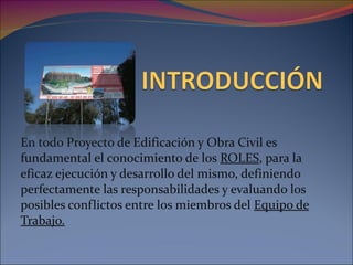 Este documento describe los roles clave en un proyecto de construcción y obra civil. Estos incluyen al cliente, arquitecto, delineante, jefe de obra, proveedores, encargado de obra y subcontratistas. Explica las responsabilidades de cada rol, como el arquitecto que asesora al cliente e interpreta su visión, el delineante que plasma los detalles del proyecto, y el jefe de obra que ejecuta y administra el proyecto general.