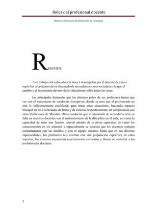 El documento analiza los roles del docente de secundaria, destacando la necesidad de que se adapten a las demandas de una sociedad en constante cambio. Se critica la insuficiencia de la formación docente actual, que no aborda adecuadamente el manejo de conductas disruptivas ni la colaboración con las familias. Se propone una visión más integral y dinámica de la educación, donde el docente debe ser un innovador y un creador del conocimiento en un contexto educativo amplio.