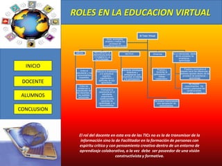 El documento describe los roles del docente y el alumno en la educación virtual. El docente debe guiar, acompañar y motivar el aprendizaje de los estudiantes de manera constructivista. El alumno debe desarrollar autonomía, espíritu crítico y responsabilidad sobre su propio aprendizaje. La tecnología permite que docentes y alumnos construyan relaciones educativas sin limitaciones de espacio o tiempo.