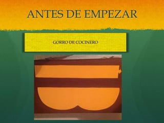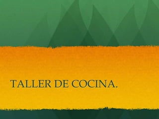 El documento proporciona instrucciones para un taller de cocina. Detalla las normas de seguridad e higiene como usar un gorro y delantal, lavarse las manos y mantener un área de trabajo limpia. También incluye pasos para seguir las recetas cuidadosamente, respetar el espacio de los demás y limpiar después de terminar. Por último, presenta una receta para rollitos de mar con torta de maíz, atún, lechuga y zanahoria.