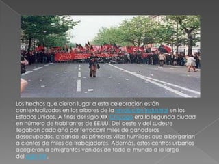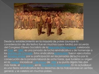 El Día del Trabajo se celebra el 1 de mayo en conmemoración de los mártires anarquistas de Chicago que fueron ejecutados en 1886 por participar en huelgas para lograr la jornada laboral de ocho horas. Originalmente establecido por el Congreso Obrero Socialista en 1889, el Día del Trabajo ahora es una fiesta reivindicativa de los derechos de los trabajadores. Los hechos que dieron lugar a esta celebración ocurrieron en el contexto de la revolución industrial en Estados Unidos a finales del siglo X
