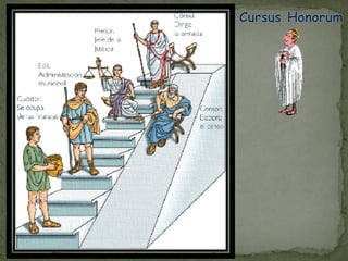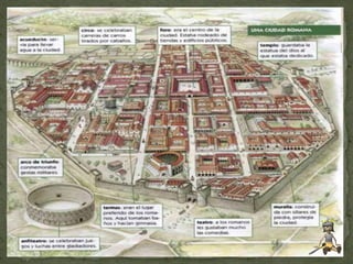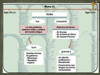 Este documento presenta un resumen cronológico de la historia de Roma desde su fundación hasta su caída. Se divide en tres etapas principales: la Monarquía (753 a.C.-509 a.C.), la República (509 a.C.-27 a.C.) y el Imperio (27 a.C.-476 d.C.). Cada etapa describe brevemente la forma de gobierno, los principales acontecimientos y la expansión territorial de Roma.