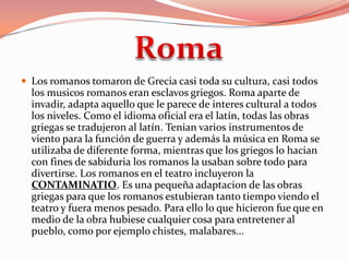 Los romanos adoptaron gran parte de la cultura griega, incluyendo la música, donde la mayoría de los músicos romanos eran esclavos griegos. Aunque el idioma oficial era el latín, las obras griegas se tradujeron. Mientras que los griegos usaban la música con fines de sabiduría, los romanos la usaban principalmente para divertirse. Los romanos también introdujeron la contaminatio en el teatro, que implicaba pequeñas adaptaciones de las obras griegas para entretener al público entre escenas con chistes y malabares.