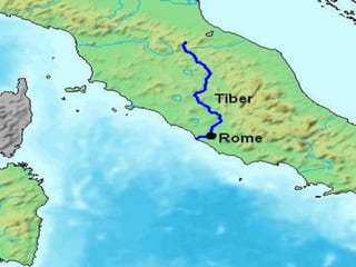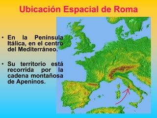 Roma se ubicó en la península itálica, en el centro del Mediterráneo. Pasó por tres etapas: la Monarquía (753-509 a.C.), la República (509-31 a.C.) y el Imperio (31 a.C.-476 d.C.). Durante la República hubo luchas entre patricios y plebeyos que terminaron con la igualdad política. Roma expandió su territorio a través de las guerras púnicas. La crisis de la República llevó al Imperio bajo el poder