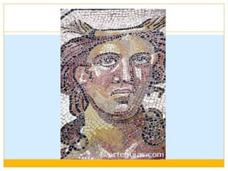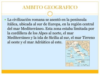 La civilización romana se desarrolló en la península itálica, en el centro del mar Mediterráneo. El arte romano se manifestó principalmente en la arquitectura de templos, basílicas y edificios públicos como teatros y el coliseo. La religión romana combinó influencias helénicas y orientales. La literatura incluyó poesía y teatro. Los romanos también hicieron contribuciones importantes a la ciencia, la medicina, la ingeniería y el derecho.