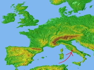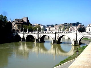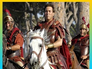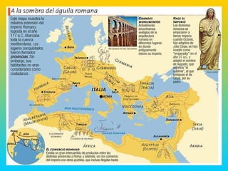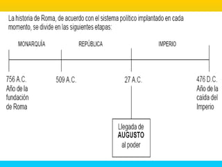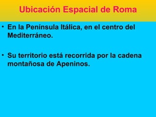 Roma se ubicó en la península itálica y su historia se divide en Monarquía, República e Imperio. Comenzó como una ciudad-estado fundada por Rómulo en el 753 a.C. y se expandió a través de las guerras púnicas para dominar el Mediterráneo. La República experimentó luchas entre patricios y plebeyos hasta que la inestabilidad llevó al establecimiento del Imperio bajo Augusto en el 31 a.C.