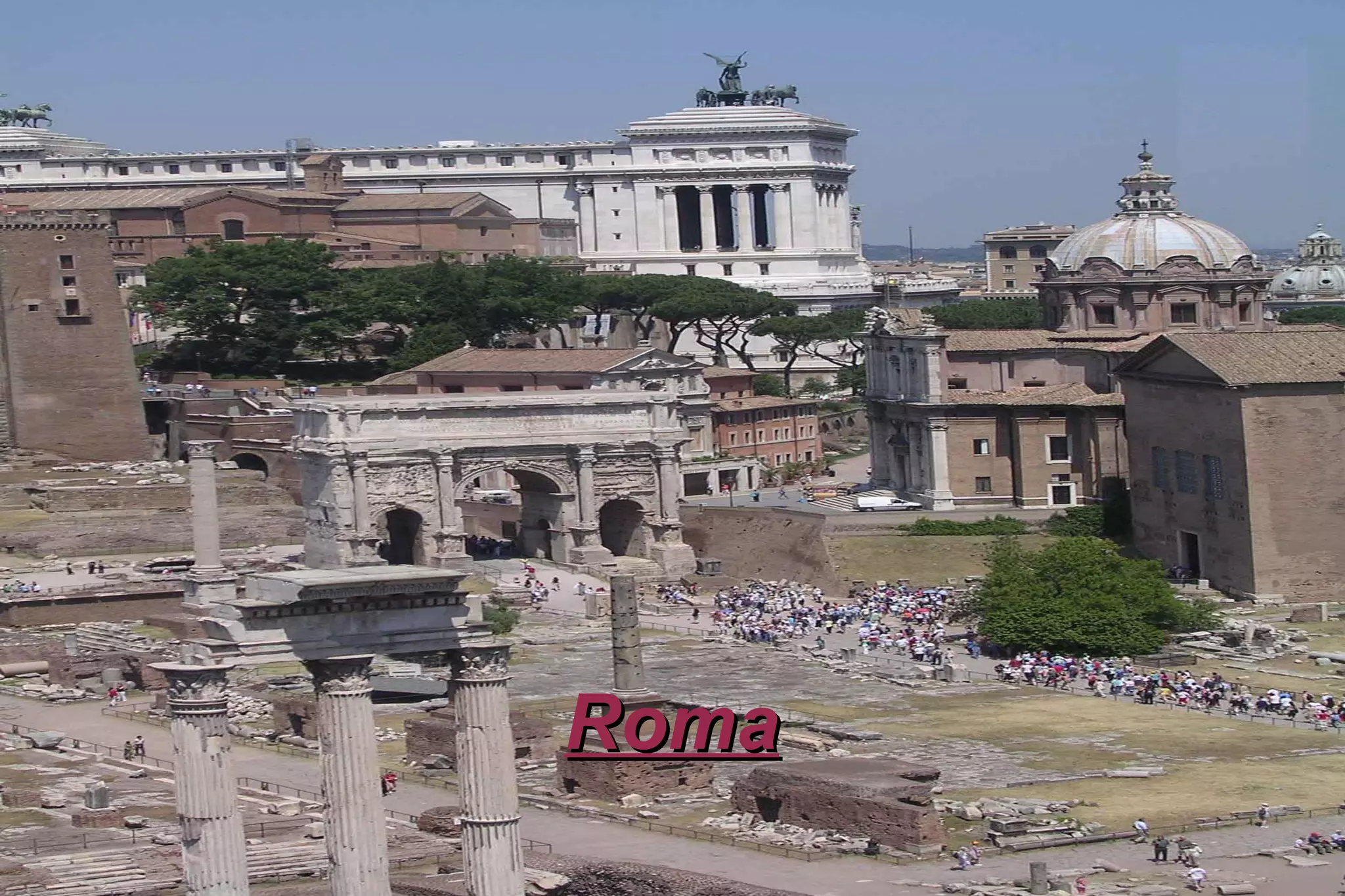 El documento lista importantes lugares y monumentos de la ciudad de Roma como el Foro de Trajano, el Coliseo, la Plaza de San Pedro y el Vaticano, el Castillo de Sant Angelo, el Teatro Romano, la Fontana di Trevi, el Arco del Triunfo Romano y la tumba de Juan Pablo II, así como a los fundadores míticos de Roma, Rómulo y Remo.