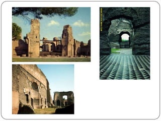 El documento resume la historia y el arte de la antigua Roma. Explica el origen legendario de la ciudad de Roma y su fundación por Rómulo. Detalla la influencia griega en el arte romano, especialmente en la escultura y la arquitectura. Describe características del arte romano como el realismo en la escultura y el uso del arte con fines de propaganda política. Finalmente, analiza importantes ejemplos de la arquitectura romana como el Coliseo, el Panteón y los arcos de triunfo.