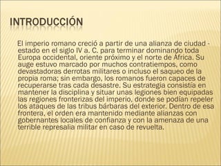 El imperio romano creció a partir de una alianza de ciudad-estados en el siglo IV a.C. para terminar dominando Europa occidental, el Oriente Próximo y el norte de África. Mantuvo su poder a través de una disciplinada milicia estacionada en las fronteras y alianzas con gobernantes locales, usando la fuerza militar para aplastar revueltas. La sociedad romana era desigual, dividiéndose entre ciudadanos, no ciudadanos e incluso esclavos.
