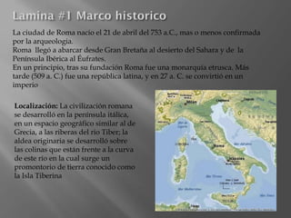 La ciudad de Roma se fundó en el año 753 a.C. en las colinas junto al río Tíber. Más tarde, Roma se convirtió en una república y luego en un imperio que se extendió desde Gran Bretaña hasta el norte de África. El Coliseo de Roma, construido en el año 72 d.C., fue el mayor anfiteatro del Imperio Romano donde se realizaban espectáculos públicos como peleas de gladiadores y cacerías de animales.