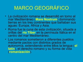 El documento proporciona información sobre la civilización romana, incluyendo su expansión geográfica alrededor del Mediterráneo, su historia desde la Monarquía hasta el Imperio y su caída, aspectos de su sociedad, economía, religión, arquitectura y otros. Se describe el desarrollo de Roma como centro de poder en la península itálica y su sometimiento de otros pueblos a través de la romanización.