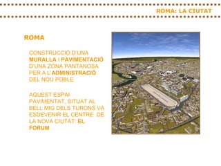 El documento describe la unión de los pueblos de los siete montes de Roma en el siglo VIII a.C. para protegerse de los etruscos, lo que dio origen a la ciudad de Roma. Se construyó una muralla y se pavimentó un área pantanosa para la administración de la nueva ciudad, que se convirtió en el Foro, el centro administrativo, político, judicial, económico, religioso y comercial de la ciudad.