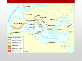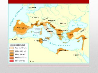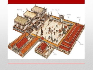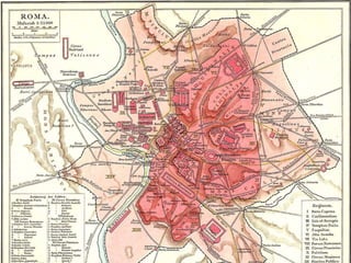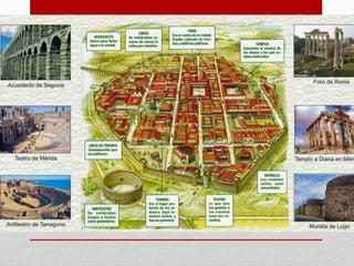 El documento describe el desarrollo urbano y arquitectónico de Roma desde la República hasta el Imperio. Explica cómo Roma pasó de ser una ciudad militar a convertirse en el centro político, económico y social del Imperio Romano a través de la implementación de infraestructura urbana como acueductos, calzadas y la fundación de ciudades. También analiza los aspectos físicos, sociales, económicos, arquitectónicos y urbanísticos que influyeron en el desarrollo de Roma