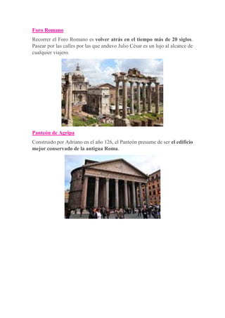 El documento describe las principales obras maestras y atracciones de la ciudad de Roma, incluyendo la Fontana de Trevi, el Coliseo Romano y el Foro Romano, que son algunos de los lugares más visitados de la ciudad y ofrecen una ventana al pasado de la antigua Roma.
