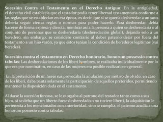 1) El documento describe varios aspectos de la sucesión en el derecho romano antiguo, como las reglas para desheredar hijos, la posibilidad de impugnar testamentos que no cumplían con el deber familiar, y el derecho de legítima para parientes cercanos.