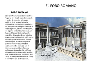 El Foro Romano era la plaza central y el centro político y comercial de la antigua Roma. Originalmente era un espacio abierto donde la gente se reunía para el mercado y eventos religiosos, pero con el tiempo se construyeron edificios gubernamentales y templos importantes, convirtiéndolo en el núcleo de la vida pública de la ciudad.