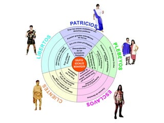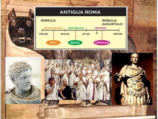 La monarquía romana evolucionó hacia una república oligárquica dominada por los patricios. Los plebeyos lucharon por igualdad de derechos, logrando acceso a magistraturas y leyes escritas. Más tarde, el Imperio emergió tras las guerras civiles, con el emperador como gobernante absoluto con poderes militares, políticos y religiosos. El Imperio trajo paz y prosperidad durante siglos, pero entró en crisis en el Bajo Imperio debido a desafíos de gobernar un