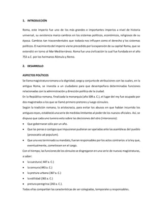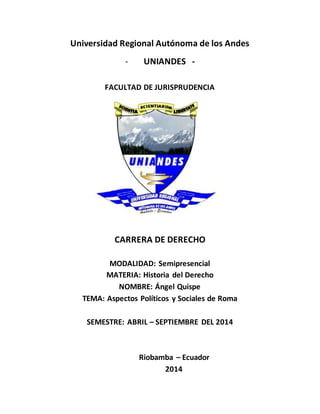 Este documento describe los aspectos políticos y sociales de la antigua Roma. Políticamente, Roma evolucionó de una monarquía a una república con varias magistraturas como cónsules, pretores y censores. La sociedad romana estaba dividida en patricios, plebeyos, clientes y esclavos. Los patricios eran la aristocracia dirigente mientras que los plebeyos carecían inicialmente de derechos políticos. Con el tiempo, los plebeyos ganaron más derechos aunque la sociedad romana