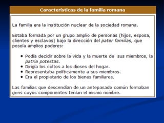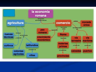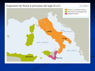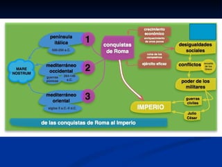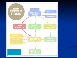 El documento resume la historia de Roma desde sus orígenes. Explica que Roma se ubicó estratégicamente en la península itálica, cerca del río Tíber, lo que le permitió desarrollarse como centro comercial. Detalla que los primeros pobladores fueron los etruscos y latinos, y que con el tiempo Roma se expandió e incorporó territorios griegos. Finalmente, resalta que Roma heredó la cultura griega y creó infraestructuras como el Coliseo y foros que marcaron su legado