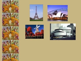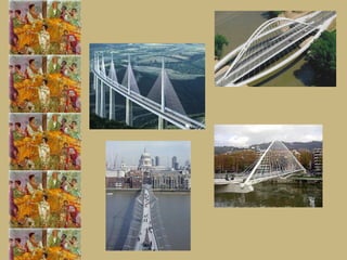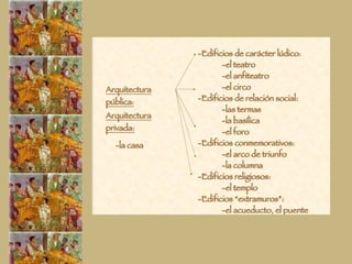 El documento describe diferentes tipologías de arquitectura romana, incluyendo arquitectura religiosa como templos, arquitectura civil pública como termas y basílicas, arquitectura para espectáculos como anfiteatros y circos, monumentos conmemorativos como arcos de triunfo y columnas, arquitectura doméstica como casas y villas, arquitectura funeraria como tumbas, y obras públicas de ingeniería como puentes, acueductos y calzadas. También describe aspectos del urbanismo romano como la