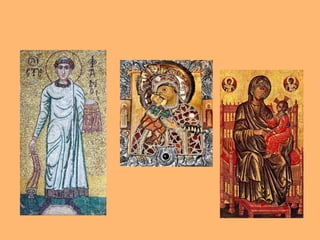 El documento presenta una introducción al Imperio Romano y Bizantino. Brevemente describe los orígenes de Roma y su expansión para formar un imperio que eventualmente se dividió en dos partes, una en Occidente con capital en Roma y otra en Oriente con capital en Constantinopla. También presenta información sobre figuras históricas clave como Julio César, el cristianismo primitivo en Roma, y detalles sobre arte, arquitectura y vida cotidiana en el imperio romano y bizantino.