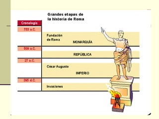 El documento resume la civilización romana desde sus orígenes en el siglo IX a.C. en la península itálica hasta el establecimiento del Imperio bajo Augusto en el siglo I a.C. Detalla la fundación mítica de Roma, la monarquía romana, el establecimiento de la República y la expansión por Italia y el Mediterráneo a través de las guerras púnicas. Finalmente, explica el colapso de la República debido a conflictos civiles y el ascenso de Julio C