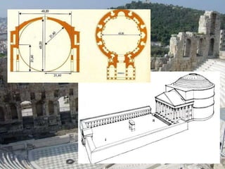 El documento describe la ubicación, función y características arquitectónicas del Coliseo de Roma. El Coliseo se encuentra en el valle del Foro Romano y fue construido para albergar espectáculos públicos como peleas de gladiadores y representaciones teatrales. Con forma ovalada, tenía capacidad para 50,000 personas distribuidas en gradas según su estatus social.