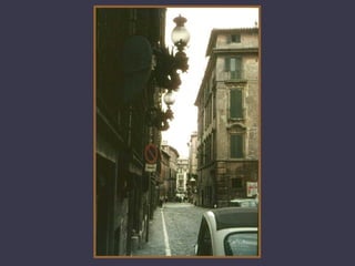 Este documento contiene una lista de lugares y monumentos famosos de Roma que fueron fotografiados en 1968, incluyendo Castel Sant'Angelo, el Coliseo, la Fontana di Trevi, las ruinas del Foro Romano, el Monumento a Vittorio Emanuele, la Basílica de San Pedro y la Plaza de San Pedro, la Trinitá dei Monti, vistas del Río Tiber y sus puentes. Las fotos fueron tomadas y presentadas por Laura Milani, con música de Las Bodas de Fígaro de Mozart.