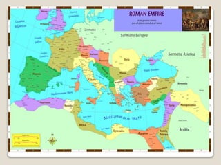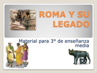 Roma fue fundada en el 753 a.C. y gobernada inicialmente por reyes. Luego se estableció la República en el 509 a.C., con un gobierno representativo dividido en poderes legislativo, ejecutivo y judicial. La República colapsó luego de conflictos sociales y guerras civiles, dando paso al Imperio en el 31 a.C., donde el poder se concentró en la figura del emperador. El Imperio alcanzó su máximo esplendor entre los siglos I y II d.C., pero entró en crisis