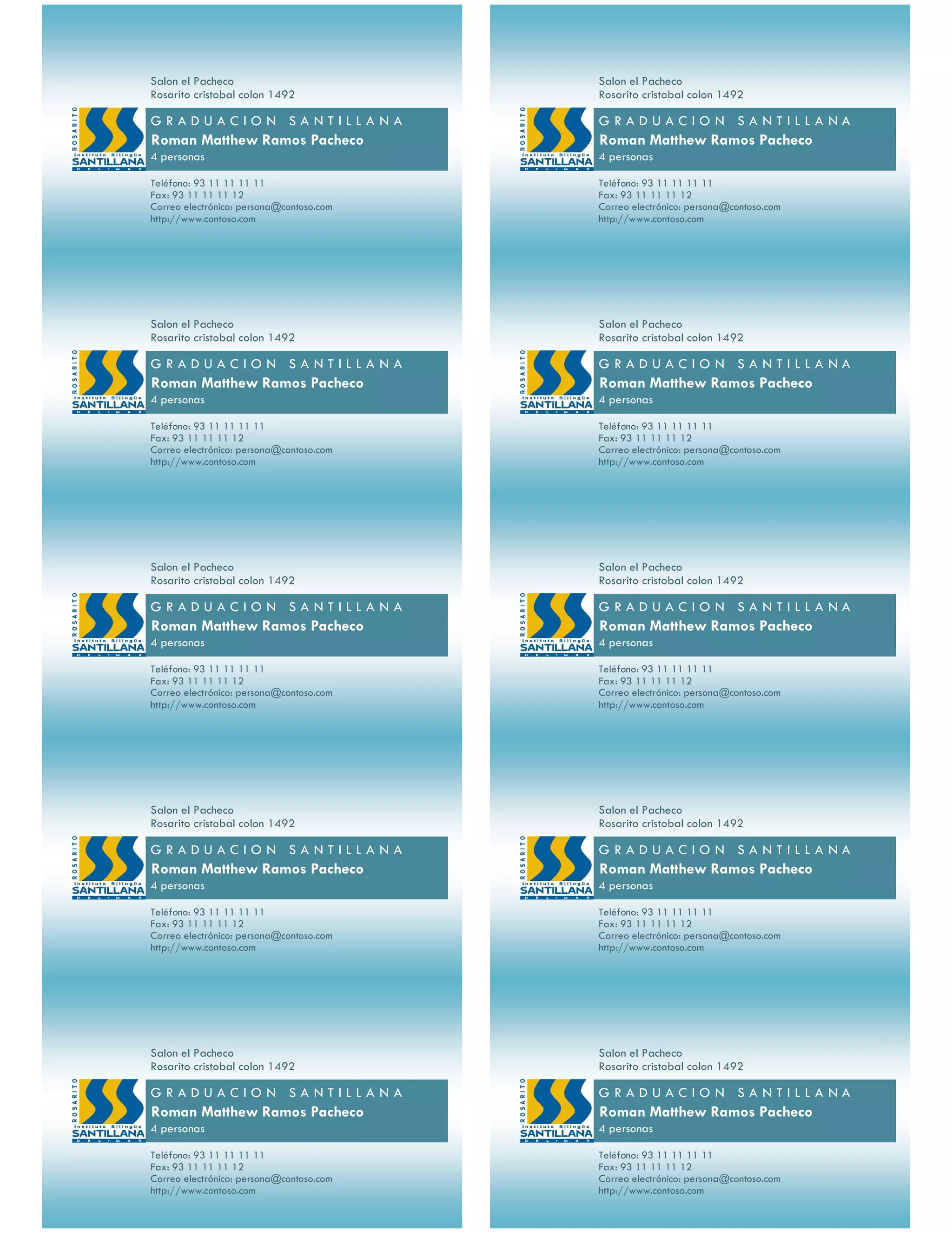 El documento proporciona información repetida sobre Salon el Pacheco en Rosarito, Cristobal Colon 1492, incluyendo detalles sobre la graduación de Roman Matthew Ramos Pacheco y 4 personas más, así como sus números de teléfono, fax, correo electrónico y sitio web.