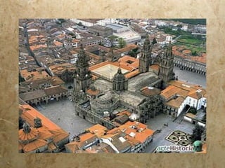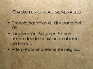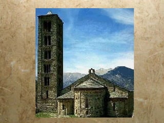 El documento describe las características generales del arte románico en la Edad Media, incluyendo su cronología, localización y arquitectura predominante. El estilo románico surgió en el siglo XI en Francia y se extendió por Europa, caracterizado por iglesias y monasterios de piedra con gruesos muros, bóvedas de cañón y arcos de medio punto. Algunos ejemplos notables son la catedral de Santiago de Compostela, la iglesia de San Clemente de Tahull y el monasterio de Ripoll.