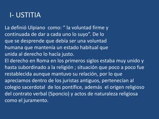 1) Los romanos consideraban que el derecho era necesario para el desarrollo de su sociedad y lo entendían como el conjunto de normas que rigen el actuar de las personas. 2) El derecho romano temprano estaba fuertemente influenciado por la religión. 3) Servio Tulio reformó la organización social y militar de Roma dividiendo el territorio en tribus y estableciendo un censo que determinaba los deberes de cada ciudadano.
