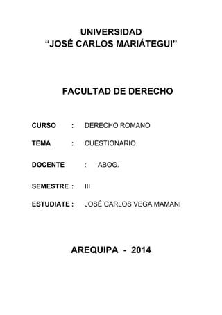 Este documento contiene 14 preguntas y respuestas sobre derecho romano. Brevemente resume lo siguiente: