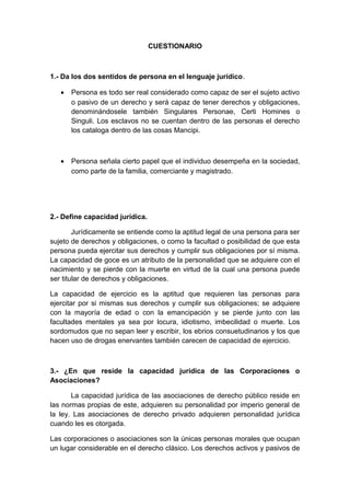1. Define la capacidad jurídica como la aptitud legal de una persona para ser sujeto de derechos y obligaciones.
