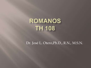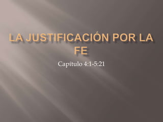 Este documento resume el capítulo 4 del libro Romanos de la Biblia. Explica que Pablo usa el ejemplo de Abraham para mostrar que la justificación por la fe, no por las obras, era la doctrina del Antiguo Testamento. También analiza los puntos clave del capítulo sobre la salvación por la fe y la circuncisión como sello de la justicia de Abraham. Finalmente, resume brevemente los beneficios de la justificación explicados en el capítulo 5, incluyendo la nueva relación con Dios y un nuevo concepto del sufrimiento.