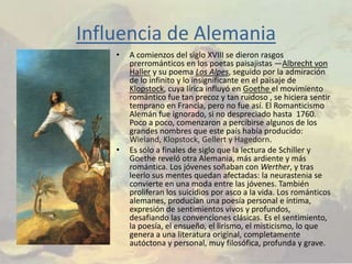 El documento resume las características y la evolución del movimiento romántico en Europa. Comenzó en Alemania y Gran Bretaña en el siglo 18 como una reacción contra el neoclasicismo, dando prioridad a los sentimientos. Luego se extendió a otros países como Francia, Italia, España y Portugal en el siglo 19. Algunos de los exponentes más importantes fueron Wordsworth, Coleridge, Goethe y Schiller en Inglaterra y Alemania respectivamente. El romanticismo introdujo temas como la naturaleza, el amor, la libertad y lo