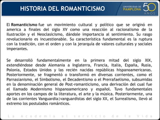 El documento describe el Romanticismo como un movimiento cultural que surgió en el siglo XVIII en reacción al racionalismo de la Ilustración. Se extendió por Europa y América entre los siglos XVIII y XIX. En la música, el Romanticismo dio importancia a la expresión de sentimientos y emociones a través de nuevos géneros como la música programática y el poema sinfónico. Compositores como Beethoven, Weber y Mendelssohn influyeron en el desarrollo del Romanticismo musical.