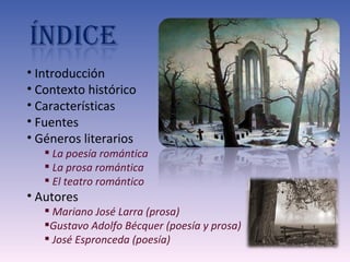 El documento presenta el movimiento romántico en España. Surge como reacción al racionalismo de la Ilustración en el siglo XIX en el contexto de la Revolución Industrial y las revoluciones liberales. Se caracteriza por la libertad individual, la originalidad, el nacionalismo y la evasión a mundos fantásticos. Algunos autores representativos son Larra, Bécquer y Espronceda.