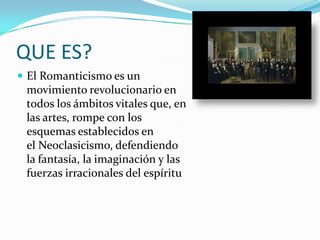 El documento resume el movimiento del Romanticismo. Rompió con los esquemas del Neoclasicismo defendiendo la imaginación y las fuerzas irracionales. Tuvo su origen en el siglo XVII en Inglaterra con el significado de "emocionante" y "amoroso". En Alemania fue empleado como sinónimo de "medieval". El Romanticismo abarcó la primera mitad del siglo XIX, una época de tensiones políticas entre conservadores y liberales. Se caracterizó por la libertad creativa, el subjetivismo, la importancia de los sentim