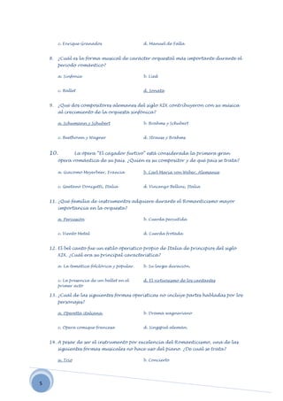 El documento contiene 26 preguntas de opción múltiple sobre música y arte del periodo romántico. Las preguntas abarcan temas como instrumentos musicales, compositores, formas musicales como la ópera y el lied, y características de la música nacionalista y del bel canto.