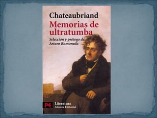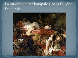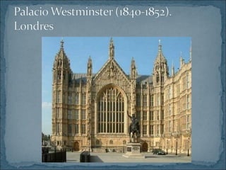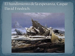 El Romanticismo se originó a finales del siglo XVIII y se desarrolló principalmente en la primera mitad del siglo XIX, exaltando las pasiones y sentimientos individuales frente a las normas académicas. Los artistas románticos buscaban nuevas formas de expresión para manifestar su impulso creativo a través de géneros como la novela histórica, el paisaje y la arquitectura neogótica.