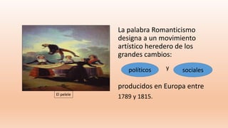 El documento resume los principales aspectos del movimiento romántico en Europa entre finales del siglo XVIII y principios del XIX. El romanticismo surgió como reacción al racionalismo ilustrado, enfatizando la imaginación, las emociones y lo subjetivo. Algunos de los autores más destacados fueron Goethe, Hugo y Poe, quienes exploraron temas como el nacionalismo, la naturaleza y el terror a través de géneros como la poesía, la novela y el teatro.