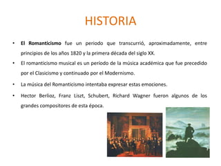 El Romanticismo fue un periodo musical entre 1820-1900 que buscaba expresar emociones a través de melodías más amplias y cromáticas. Compositores notables incluyen a Schubert, Chopin, Liszt, Wagner y Berlioz. El género del lied alemán y la ópera experimentaron un gran desarrollo. La música programática y nacionalista también emergieron durante este periodo.