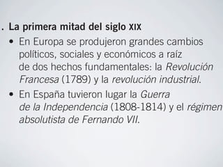 El documento resume las características principales del Romanticismo en literatura. Se desarrolló en Europa en la primera mitad del siglo XIX tras la Revolución Francesa y la revolución industrial. En España coincidió con la Guerra de Independencia y el régimen de Fernando VII. La literatura romántica daba importancia a la libertad, originalidad e individualismo, y se expresaba a través de la poesía lírica y narrativa y la prosa de ficción. Autores importantes fueron Lord Byron, Goethe, Espronceda, Bécquer y Rosal