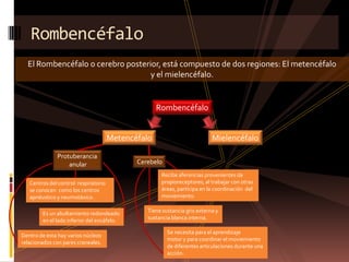 El rombencéfalo está compuesto del metencéfalo y el mielencéfalo. El metencéfalo incluye la protuberancia anular, que contiene núcleos relacionados con pares craneales, y el cerebelo, que ayuda a coordinar el movimiento. El mielencéfalo consiste en el bulbo raquídeo, el cual contiene neuronas que regulan la respiración y la presión arterial y por el que pasan todos los tractos ascendentes y descendentes.