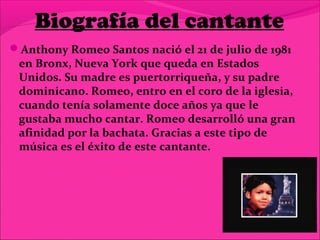Anthony Romeo Santos nació en 1981 en el Bronx, Nueva York de padres puertorriqueños y dominicanos. Se unió al coro de su iglesia a los 12 años y desarrolló una gran afinidad por la bachata. Formó parte de la banda Aventura, con la que alcanzó gran éxito internacional. Tras el éxito de Aventura, inició su carrera como solista en 2011.